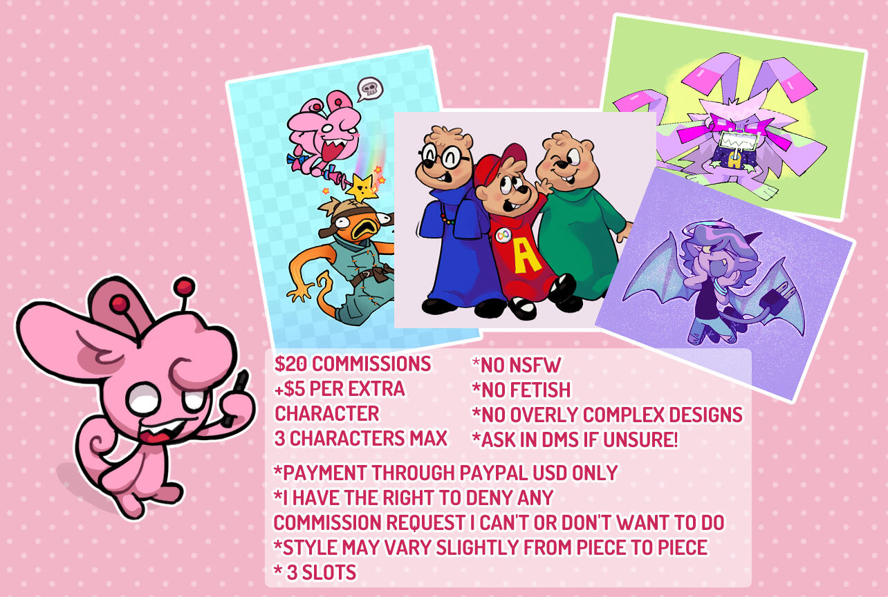 Hi! I'm seven. I'm an illustrator among other things and i like to draw silly characters. My commissions are almost always open unless explicitely stated otherwise! Click prices for pricing, and TOS for stuff i will and won't.